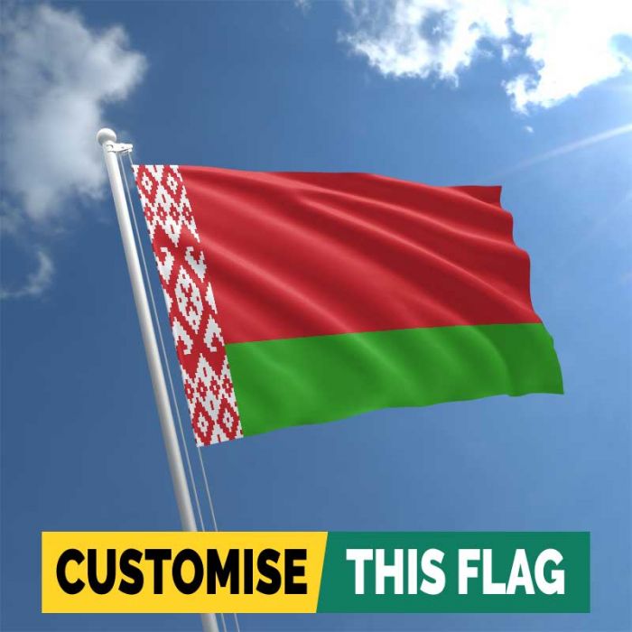 Make a unique and colourful statement with a custom printed Belarus flag. Using our free online flag customising software, you can easily add text, images or logos to the flag of the Belarus creating a one-off eye catching bespoke design. There is no limit to the number of colours or amount of customisation as all our professional quality custom flags are digitally printing, so go as design crazy as you like!